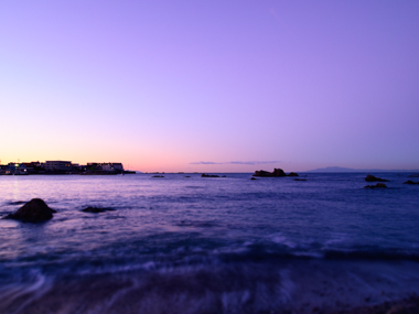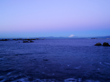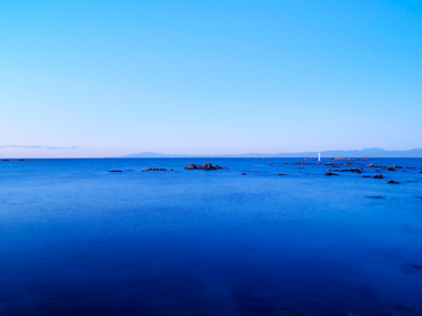 冬の濃紺の海は、朝日を浴びて明るい青へと変化し、